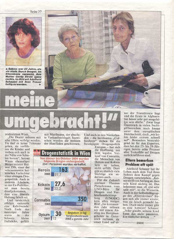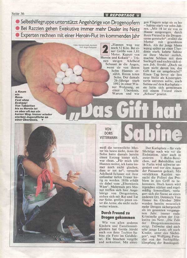 Sabine war 23 Jahre alt und starb an einer Überdosis Heroin! Welcher Schmerz müssen die Eltern von Sabine ertragen,die Ihre einzige Tochter an die Droge Heroin verloren haben ! Sie werden täglich und Ihr ganzes Leben erinnert und müssen damit Leben! Kann man sich das überhaupt vorstellen????