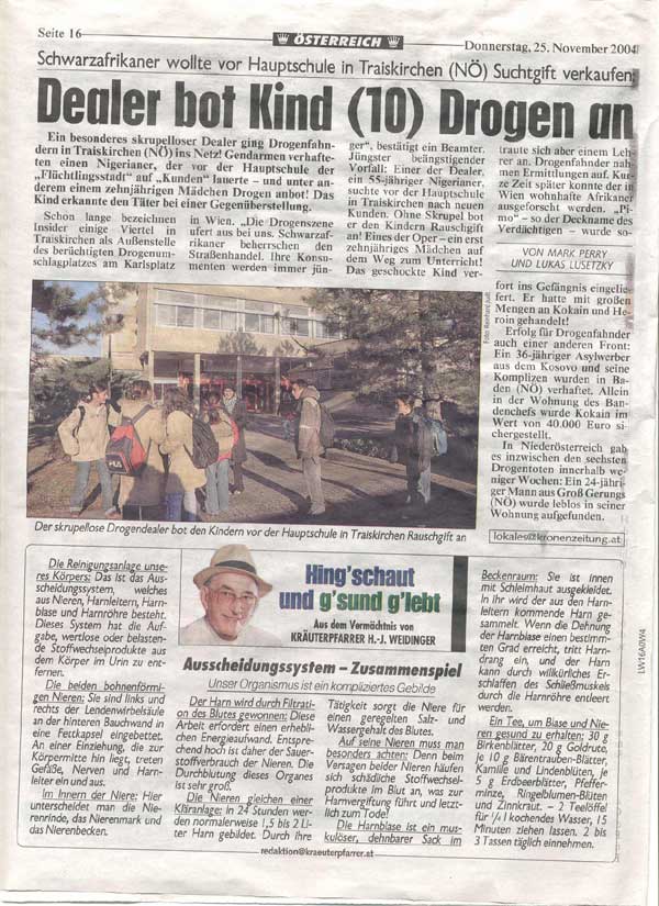 Viele Leser werden über den Bericht in der Kronen Zeitung "Dealer bot Kind (10) Drogen an" erstaunt gewesen sein! Also,Hand aufs Herz-- das hat leider kommen müssen und die Gefahr ist derzeit RIESENGROSS! Dealer haben kein Herz und auch keinen Verstand! Es ist Ihnen nur wichtig Geld damit zu verdienen--und das an wem auch immer. Kinder sind ja doch das leichteste Opfer, Kinder sind auch leicht zu überzeugen wenn Sie nicht von zu Hause ein grosses Selbstbewusstsein eingeimpft bekommen!