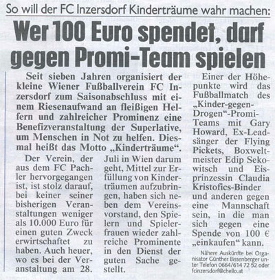Viele Prominente werden den Fussballplatz von FC Inzersdorf am Samstag
