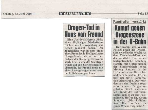 Jetzt kommt wieder das Donauinselfest, mit dieser grossartigen Veranstaltung sehen auch die Drogendealer ihr grosses Geschäft und sie werden auch sicher nicht Halt machen vor unseren Kindern und Jugendlichen.