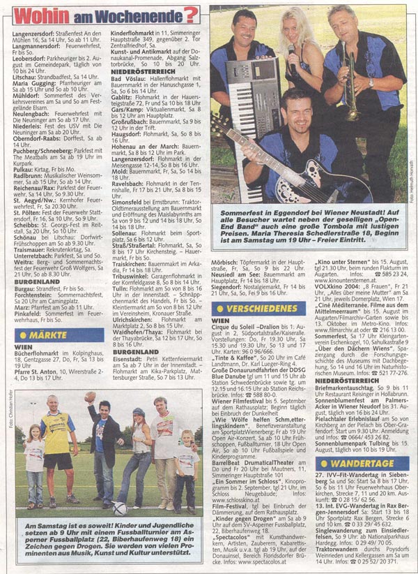 Habe einen netten Anruf von Herrn Günther Bissenberger bekommen,der mir berichtet hat,das die Veranstaltung am Samstag ,den 31.Juli 2004 auf dem SV-Asperner Fussballplatz in der Kronen Zeitung steht! Ich muss ganz ehrlich gestehen,das ich immer vor Events sehr nervöis und nachdenklich bin und daher den Bericht überflog.